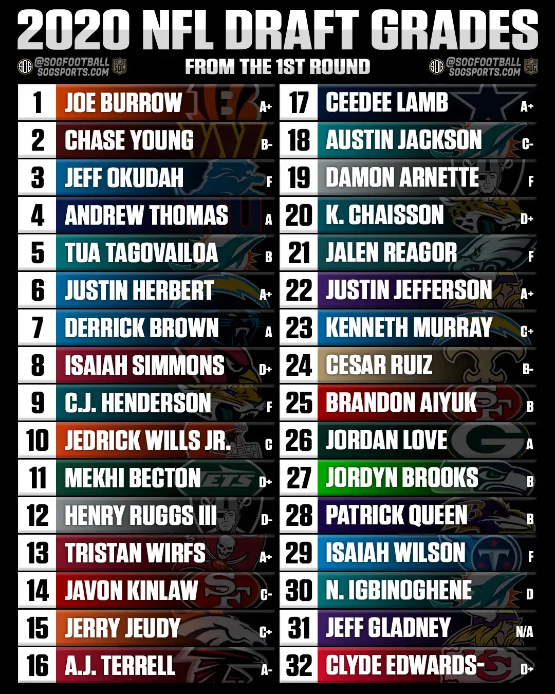 The Chargers got a franchise quarterback at No. 6 and never had to overthink it again. Herbert has the arm, the production, and the type of long-term value that makes this an obvious A+. In hindsight, he is one of the biggest wins from the entire draft.