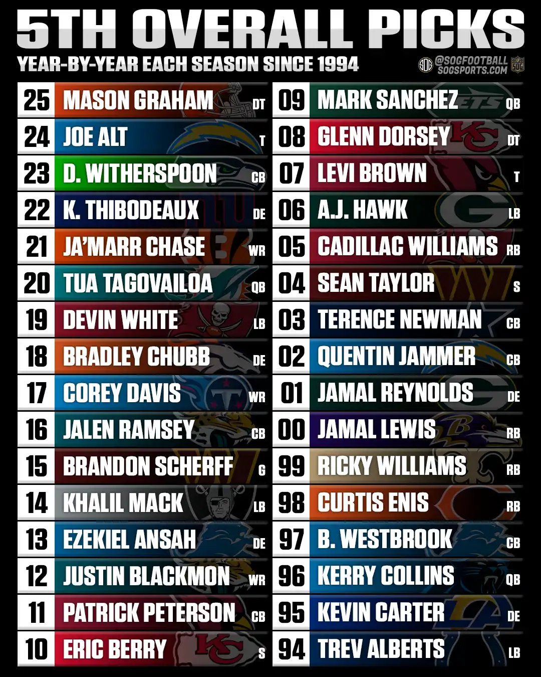 Year-by-year graphic showing every 5th overall NFL Draft pick from 1994 through 2025