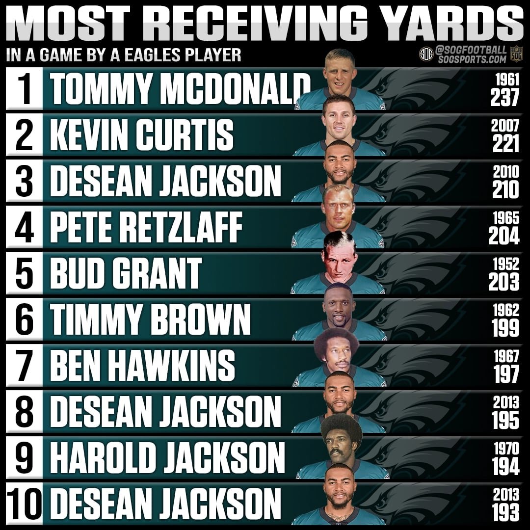 DeSean Jackson appears three times in the Top 10, including two in 2013 alone, and reminded everyone what elite speed truly looks like. But the list is more than just burners — Kevin Curtis shocked fans in 2007 with a 221-yard outburst, and Pete Retzlaff dropped 204 yards as a tight end back in the ‘60s. That’s range. That’s legacy.